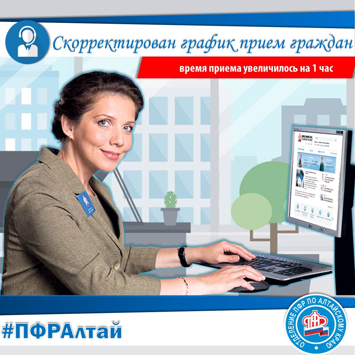 В краевом пенсионном ведомстве изменился график приема граждан, время приема увеличилось на час. Напомним, что непосредственно сам прием ведется по адресу: г.Барнаул, ул.Партизанская, 94, каб. 105 Прием граждан осуществляют не реже одного раза в месяц и управляющий Отделением, и его заместители по всем вопросам, входящим в круг их компетенций, а также ведущий специалист-эксперт отдела по работе с обращениями. Итак, прием граждан ведется в рабочие дни, с понедельника по четверг, с 8 до 17 час., а в пятницу - с 8 до 16 час.
