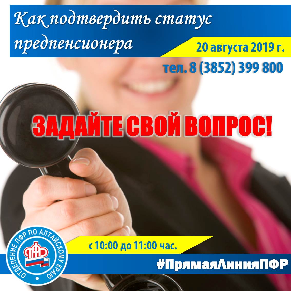 Прямые телефонные линии стали регулярными, темы – актуальными, а потому во вторник, 20 августа 2019 г. в Отделении Пенсионного фонда РФ по Алтайскому краю жителям региона ответят на все вопросы, связанные с предпенсионерами. В ходе «прямой линии» заместитель управляющего краевым пенсионным ведомством Наталия Мочалова ответит на вопросы жителей края: кто относится к категории «предпенсионеров», есть ли у них льготы, когда и как они выходят на пенсию, как подтвердить статус предпенсионера. Время проведения «прямой линии» 20 августа, во вторник, с 10 до 11 часов. Телефон - 8 (3852) 399 800