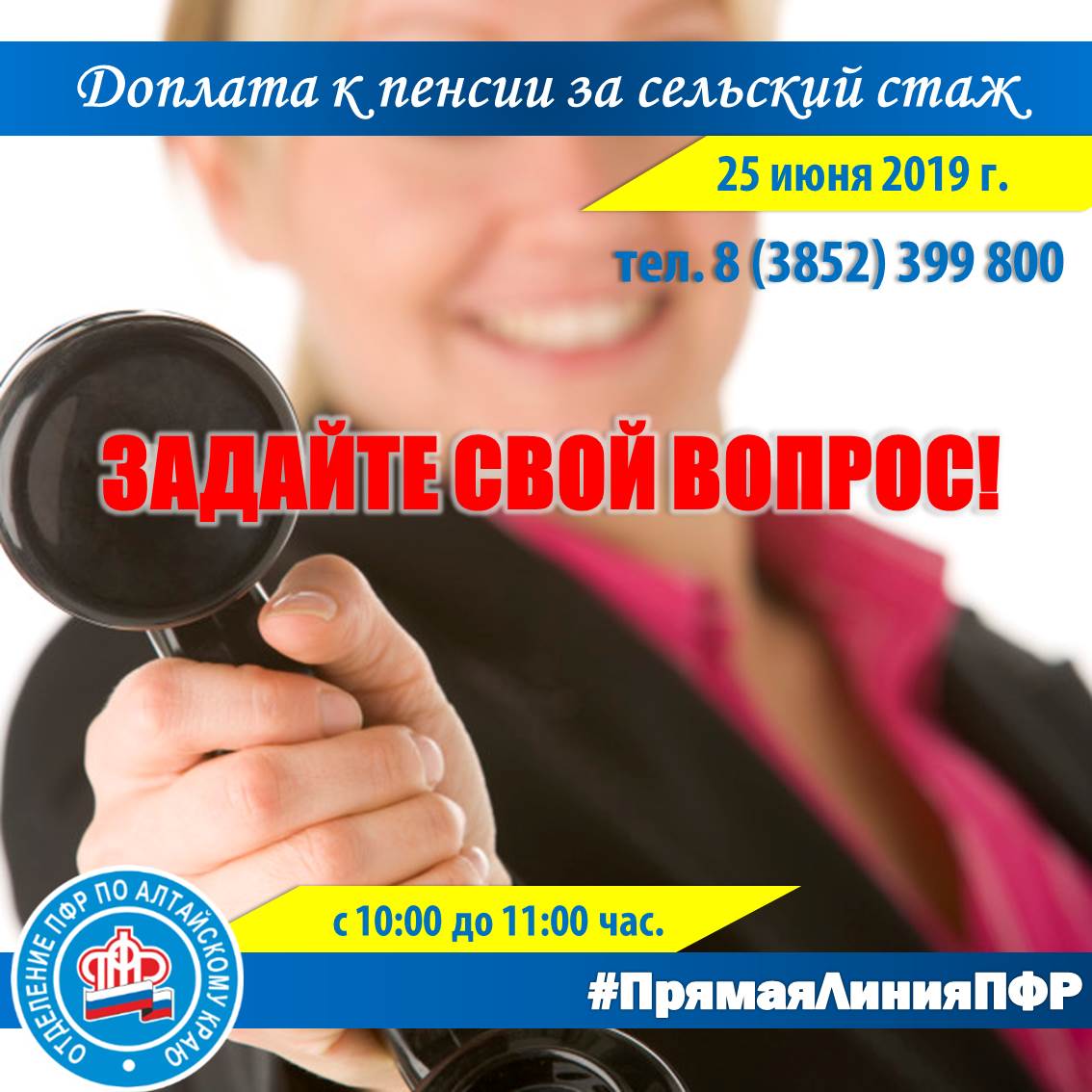 25 июня, во вторник, Отделение Пенсионного фонда РФ по Алтайскому краю проведёт «прямую телефонную линию» для жителей региона по теме дополнительной материальной поддержки жителей сельской местности. С 1 января этого года вступили в силу изменения в закон о пенсиях. Изменениями предусмотрена дополнительная материальная поддержка для неработающих пенсионеров, постоянно проживающих в сельских населенных пунктах и имеющих длительный стаж работы в сельском хозяйстве. Для них введена 25% надбавка к фиксированной выплате страховой пенсии по старости или по инвалидности.