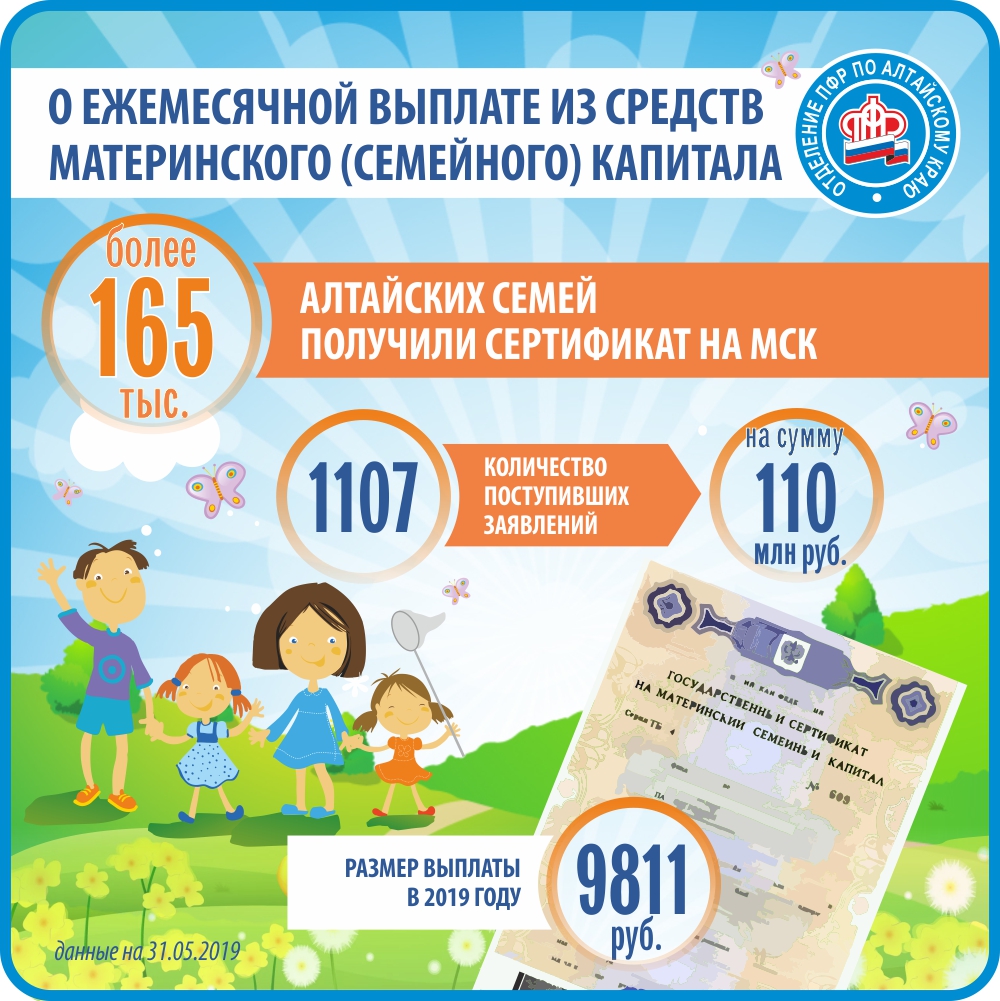 На сегодняшний день в Отделение ПФР по Алтайскому краю поступило 1107 заявлений от семей, желающих получать ежемесячную денежную выплату из средств материнского (семейного) капитала, на общую сумму 110 млн рублей. Право на такую выплату есть в тех семьях, где второй ребенок родился или был усыновлен после 1 января 2018 года. Основным условием для назначения выплаты является материальное обеспечение семьи. Так, сумма дохода на каждого члена семьи не должна превышать полтора прожиточных минимума трудоспособного гражданина, установленного в регионе.
