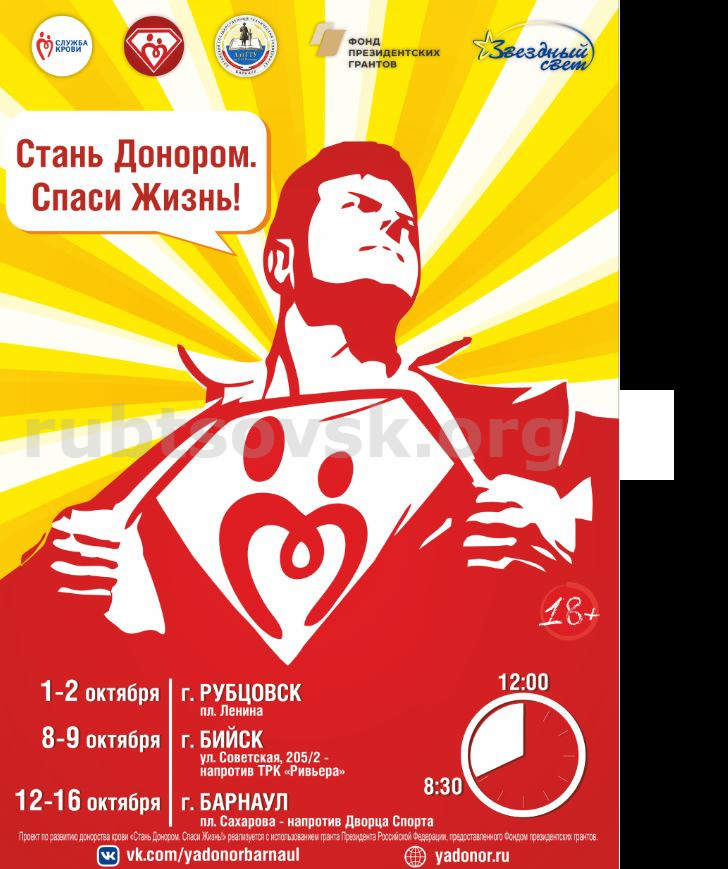 С 1 по 2 октября рубцовчане имели возможность принять участие в социальной акции «Стань Донором. Спаси Жизнь» Накануне на центральной площади города состоялось открытие акции. Глава Рубцовска Дмитрий Фельдман официально открыл акцию и поблагодарил неравнодушных и ответственных организаторов мероприятия, а также призвал жителей города не оставаться в стороне и совершить доброе дело. Организаторами данной акции является Алтайский государственный технический университет им. И.И. Ползунова и региональный общественный фонд «Звёздный свет», совместно с Фондом президентских грантов и Алтайским краевым центром крови, при поддержке Администрации города.