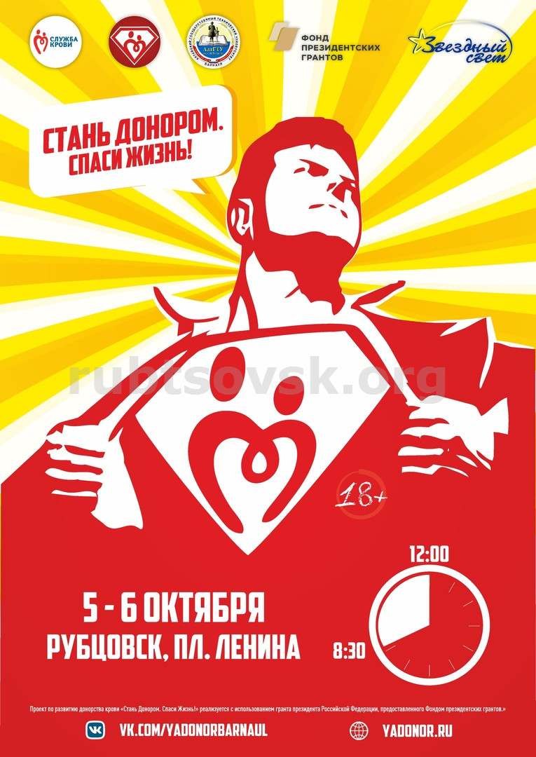 kxhqzgafcyw_v.jpgВ Рубцовске акция пройдёт 5-6 октября на площади В.И.Ленина. С 8:30 до 12:00 каждый день вас будет ждать мобильный трейлер Центра крови.