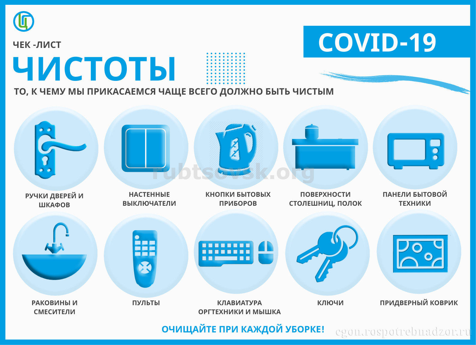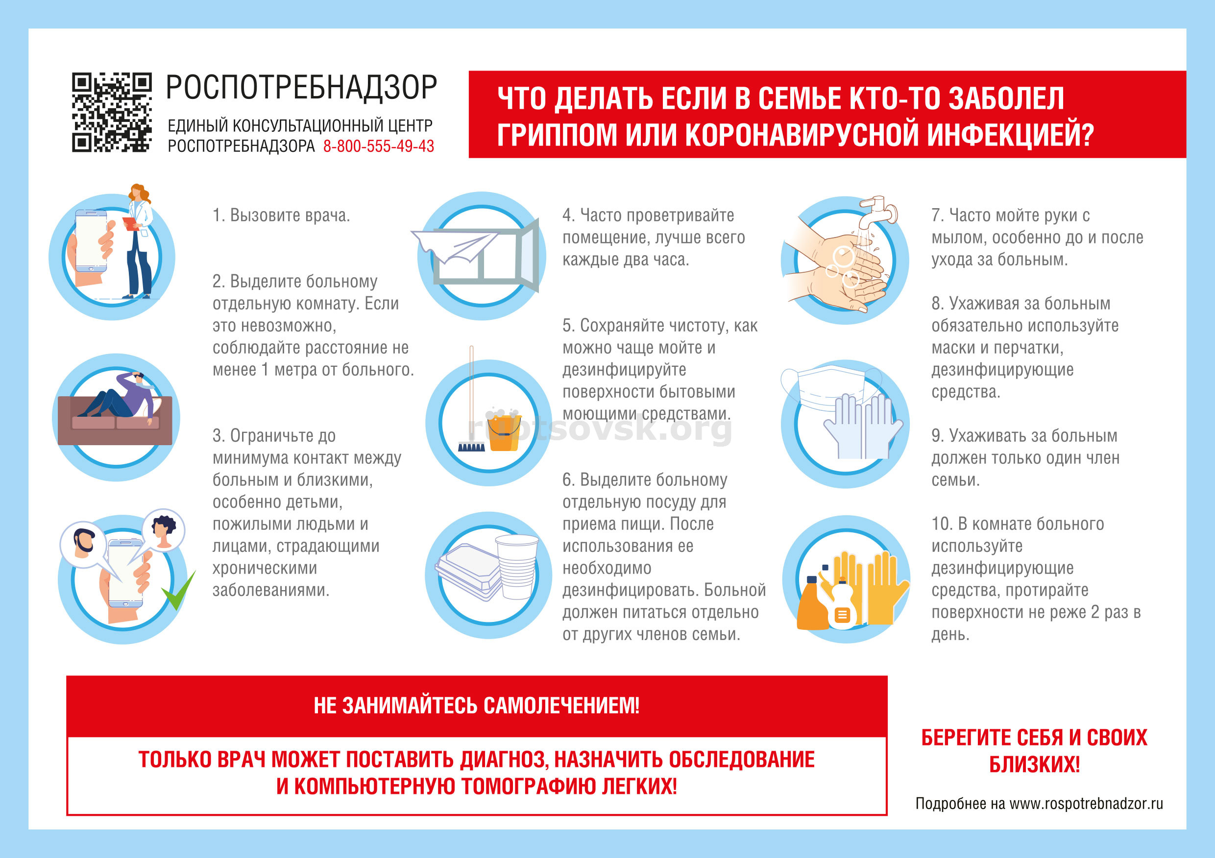 Один раз в день нужно проводить влажную уборку помещения с моющими дезинфицирующими средствами на основе катионных ПАВ – четвертичными аммониевыми соединениями, третичными аминами, полимерными производными гуанидина, а также проветривать квартиру как можно чаще. После посещения посторонними лицами помещения необходимо обрабатывать предметы и поверхности, контактирующие с руками, спиртосодержащими дезинфицирующими средствами.