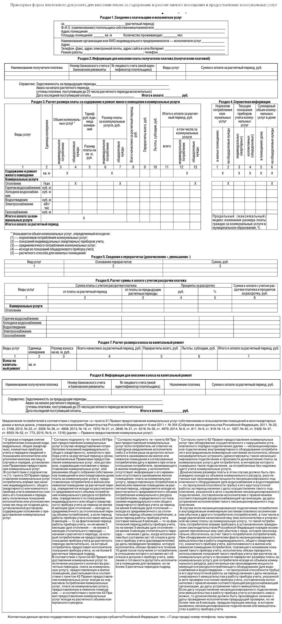 Обновленная платежка стала более объемной и информативной. Как и раньше, она состоит из нескольких разделов: сведения о плательщике, реквизиты получателя платежа, расчет размера платы за содержание и ремонт жилого помещения, за коммунальные услуги. Есть справочная информация о нормативах потребления и показаниях счетчиков, рассрочка платежа и реквизиты получателя взноса на капитальный ремонт.