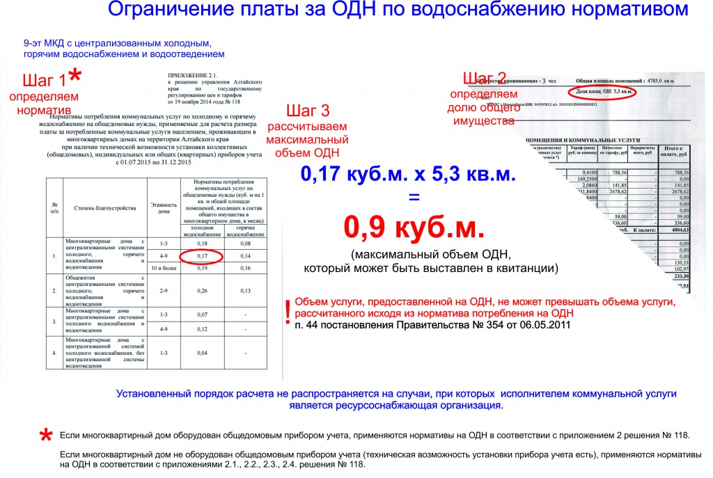 Кроме того, с 1 июля 2015 года объем общедомовых нужд по холодному и горячему водоснабжению в многоквартирных домах с общедомовыми приборами учета, выставляемый в квитанциях на оплату жилищно-коммунальных услуг, не должен превышать объема услуги, рассчитанного исходя из установленного норматива на общедомовые нужды (данная норма не распространяется на случаи, при которых исполнителем коммунальной услуги является ресурсоснабжающая организация). Объем услуги в размере превышения исполнитель (управляющая организация) должен оплачивать за счет собственных средств.