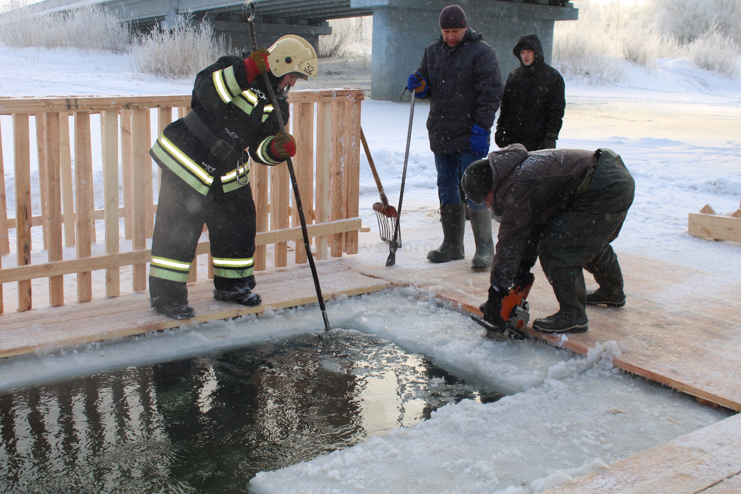 В настоящее время на месте купели выполнены работы по расчистке подъездов, дорог, парковок, устройству купели на реке Алей и сходов к ней, раздевалок, ледяных конструкций и щитов вокруг проруби. Все работы будут завершены сегодня до конца дня.