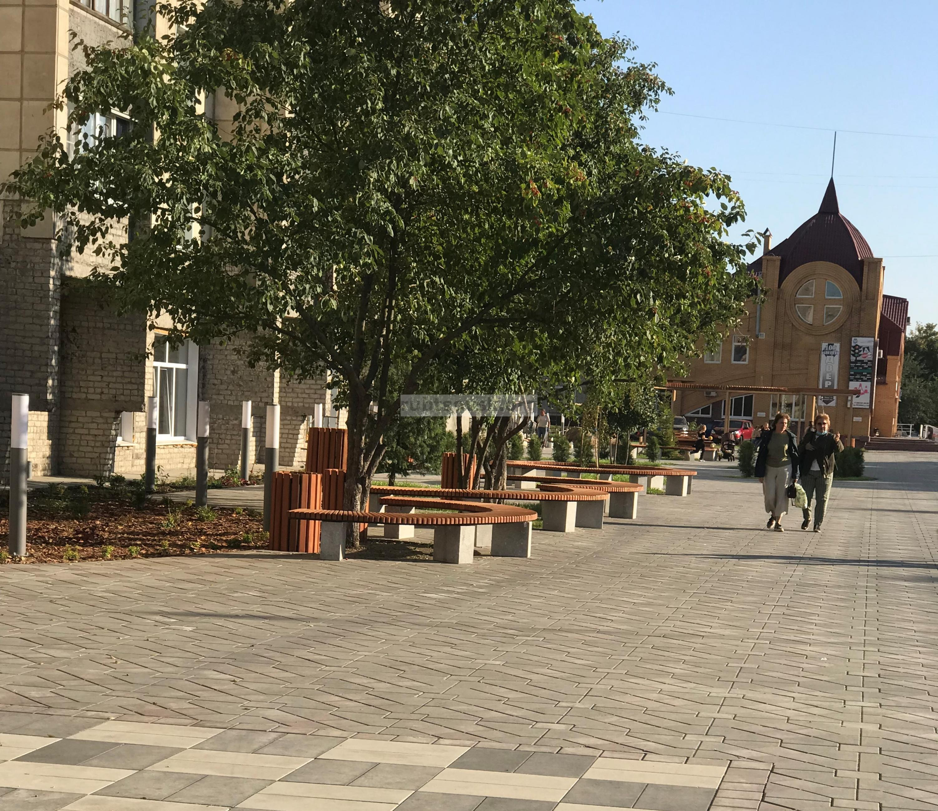СТАЛО: пешеходные дорожки, бордюры, освещение, озеленение, скамейки, урны