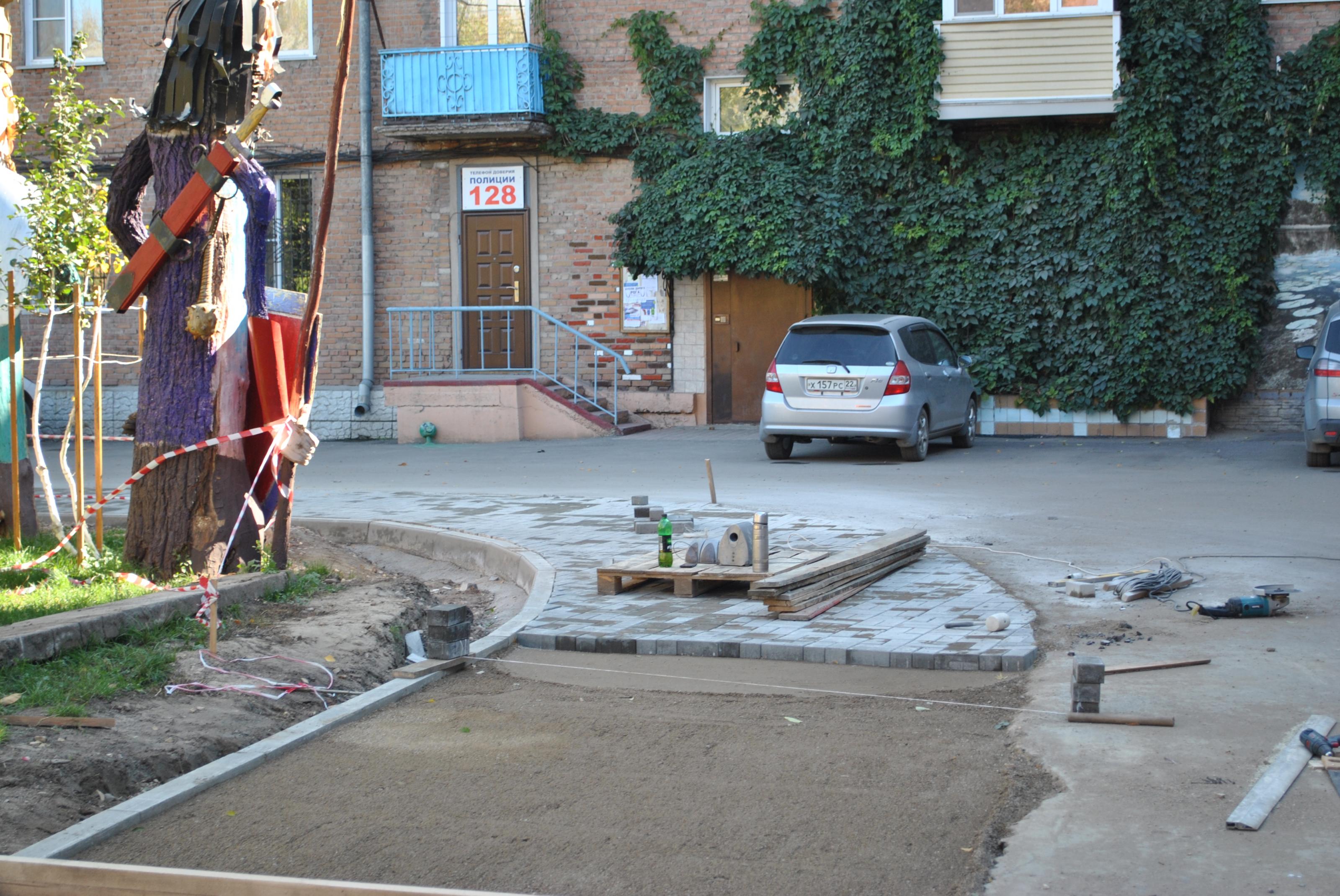 8.ул.Дзержинского, 13 – ведутся работы по укладке тротуарной плитки (часть уже уложена), установлен бордюрный камень, обустроены парковочные места, выполнен демонтаж старых деревьев.