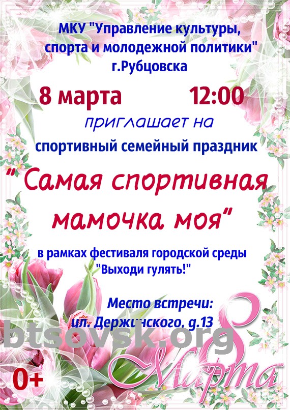 8 марта в 12 часов на площадке дома, расположенного по улице Держинского-13, в рамках проекта Фестиваль городской среды «Выходи гулять!» состоится семейный праздник «Самая спортивная мамочка моя».